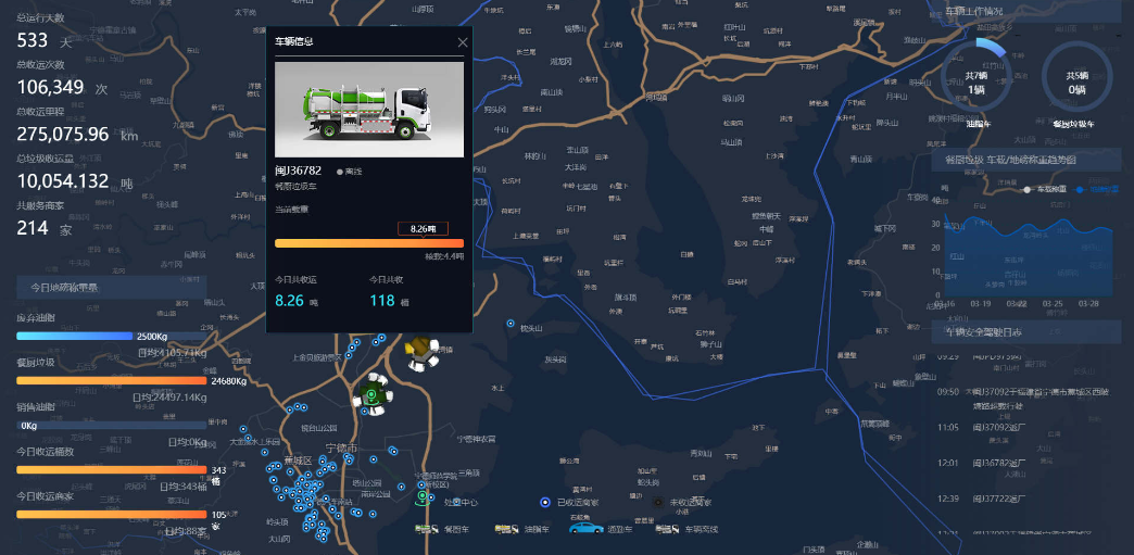 对垃圾处理站场接入环境监测设备与视频设备,实现对各项数据进行实时监测,并生成相应记录报表;在垃圾箱上安装智能传感器设备,达到溢满之后,系统可自动生成清运路线,并实时监控车辆清运完成量;垃圾清运车辆轨迹实时监测,历史轨迹回放,并对于违规点、违规线路、报警点等情况通过不同颜色标注。