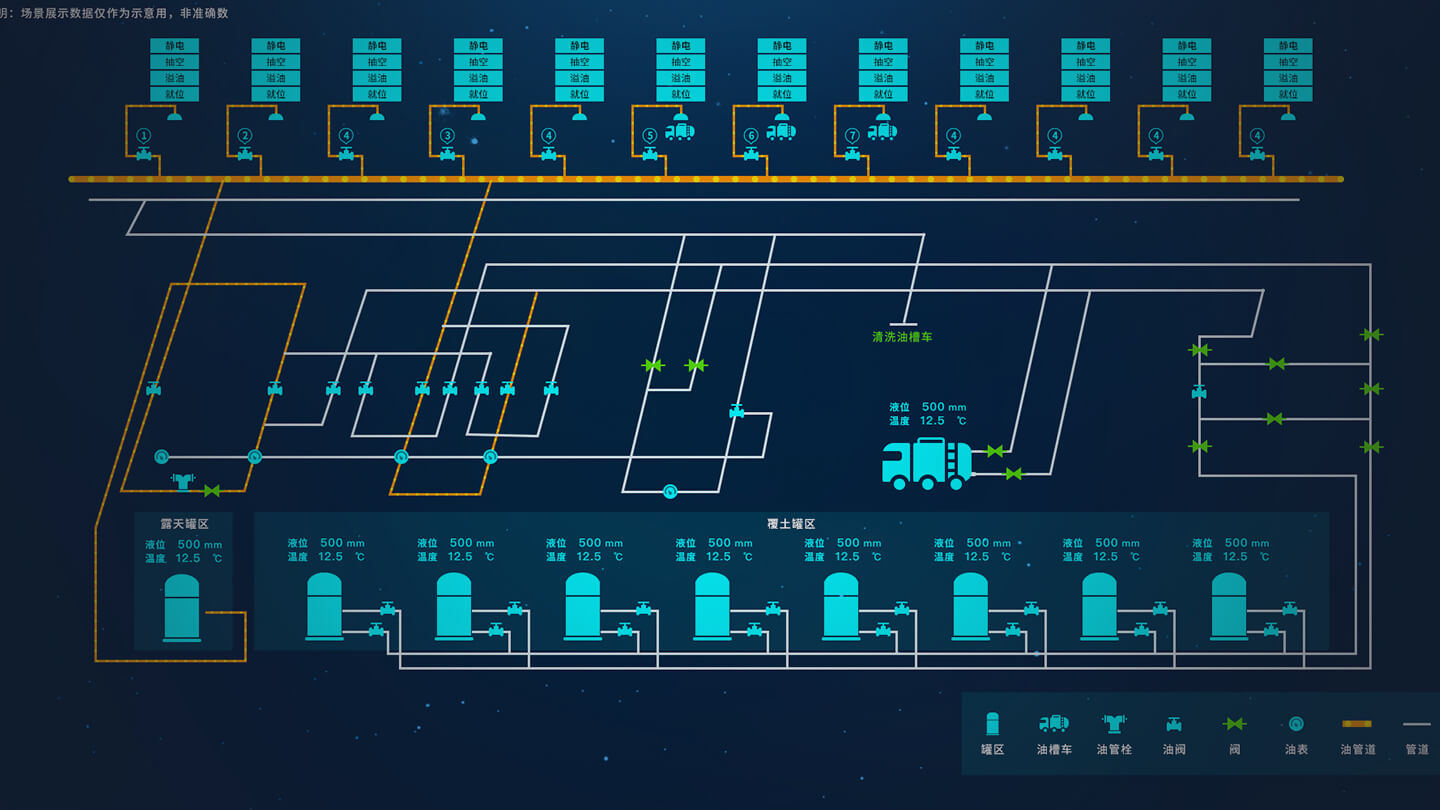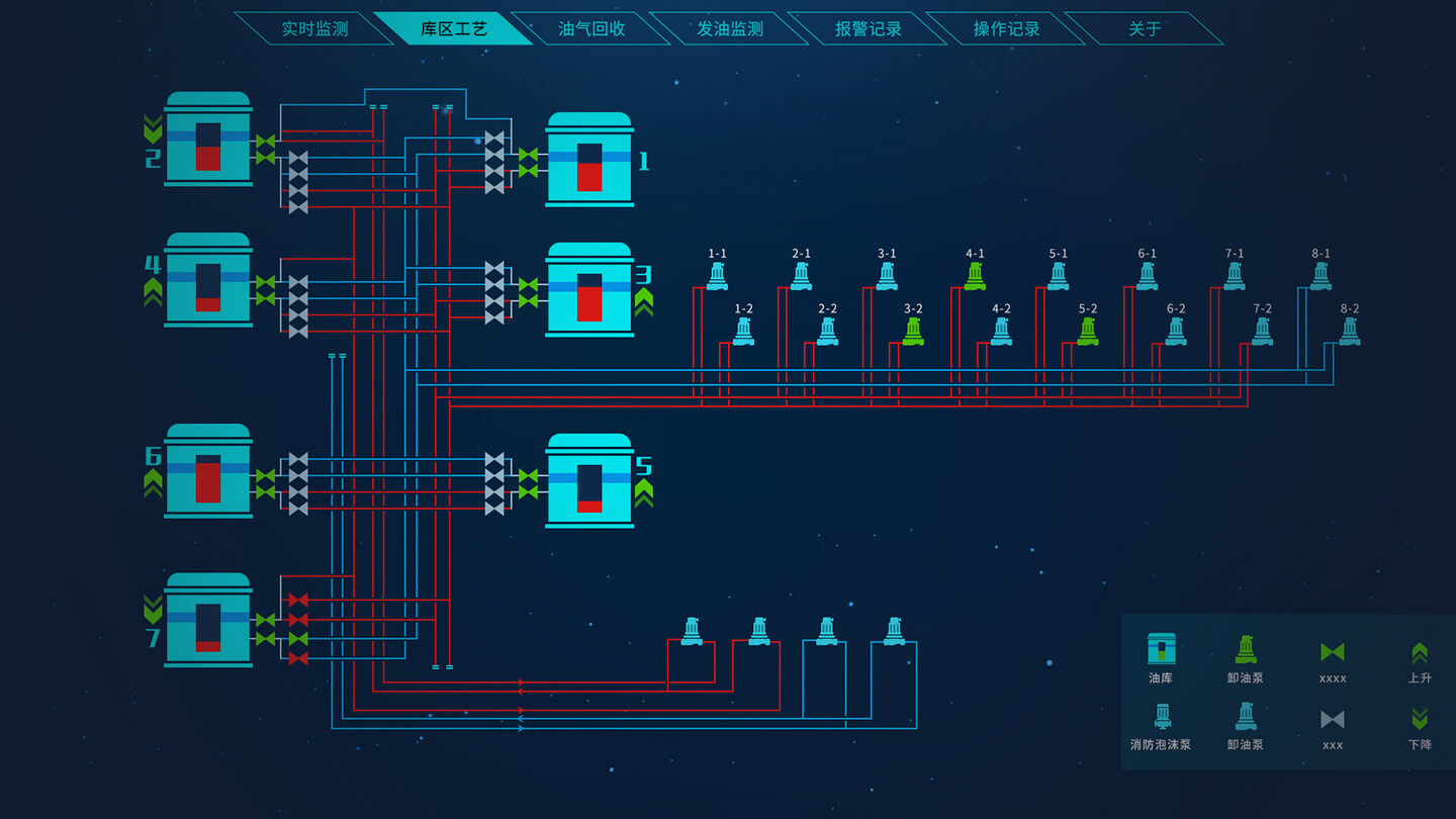 系统对进出油、管线输油和倒罐等作业进行监控,系统提供丰富的动画展示方式,包括位移、变色、闪烁、显隐等,直观显示作业进度、油品流动方向、泵阀状态等信息。